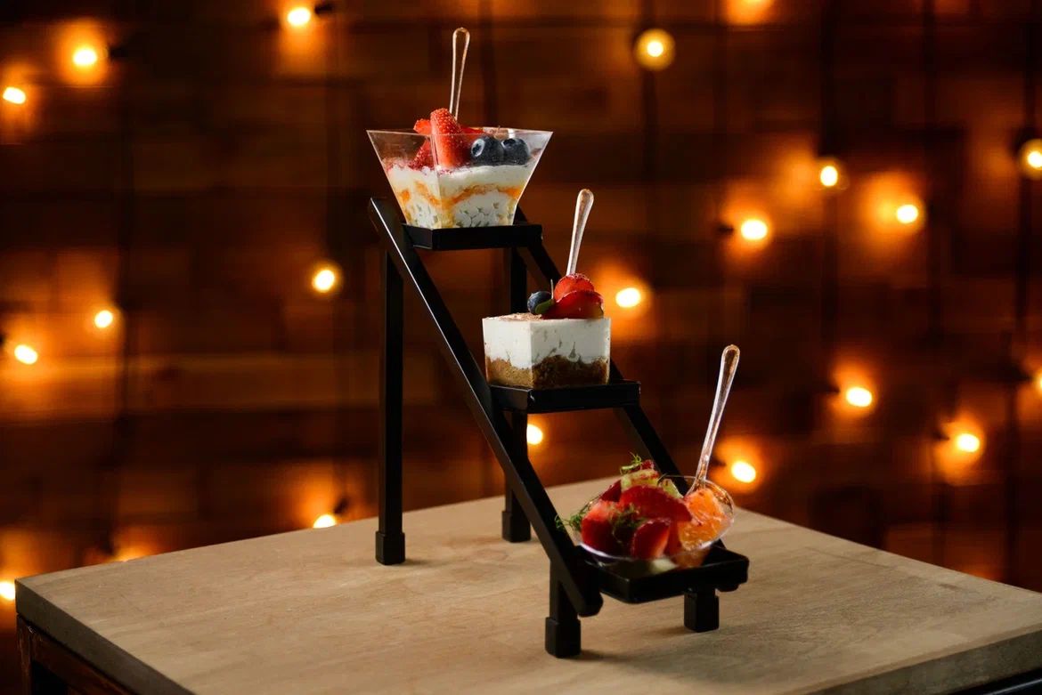 Трехъярусная металлическая стойка с стеклянными формами для порционных закусок и десертов сделает Вашу фуршетную линию эксклюзивной и запоминающейся