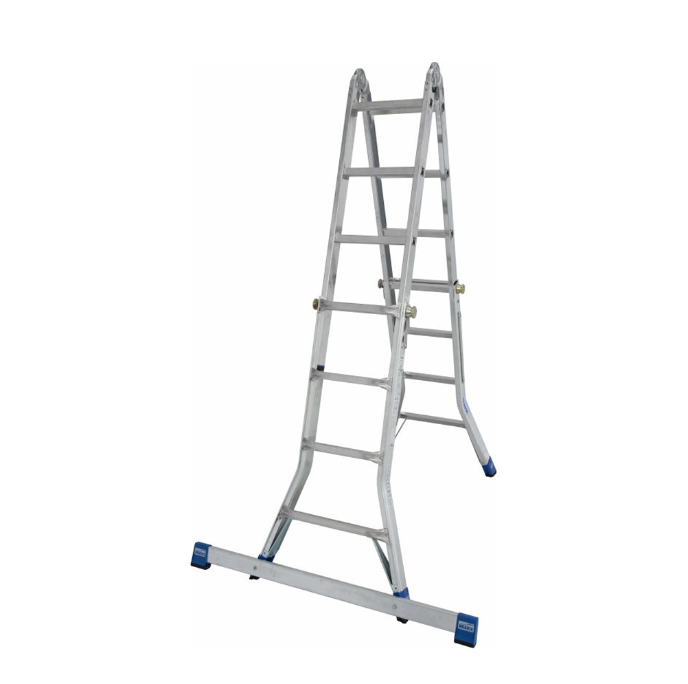 Четырехсекционная алюминиевая шарнирная лестница применяется как двусторонняя стремянка, как приставная лестница или как две отдельные двусторонние стремянки;