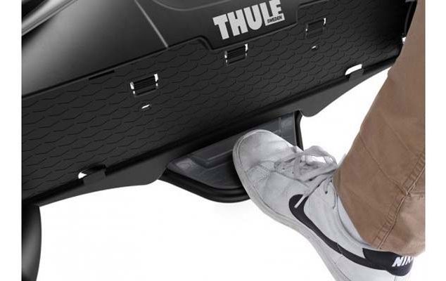 Ножная педаль позволяет наклонять велокрепление и легко снять велосипеды, а также получить доступ к багажнику авто.